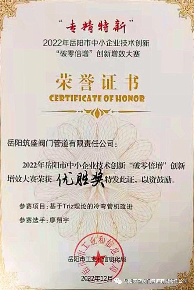 岳筑宣2022年12月6日訊:2022年12月5日我公司委派技術(shù)部廖翔宇工程師參加了2022年岳陽(yáng)市“專精特新”中小企業(yè)技術(shù)創(chuàng)新“破零倍增”創(chuàng)新增效大賽基于Triz理論的冷彎管機(jī)改進(jìn)項(xiàng)目中榮獲優(yōu)勝獎(jiǎng)!